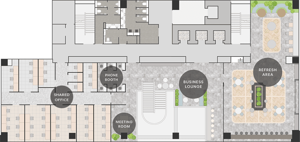 自由度の高い賃貸フロアは、企業の成長ステージに合わせたレイアウトが可能で、快適なオフィス環境と効率的な運営をサポートします。